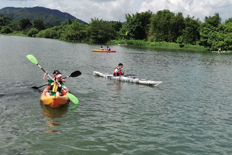 【09:30】 在教练的带领下做热身,穿戴救生衣和划艇技术培训、大合照。皮划艇下水,组织水上拓展游戏:一字连艇,水上钢琴,美丽连成圆