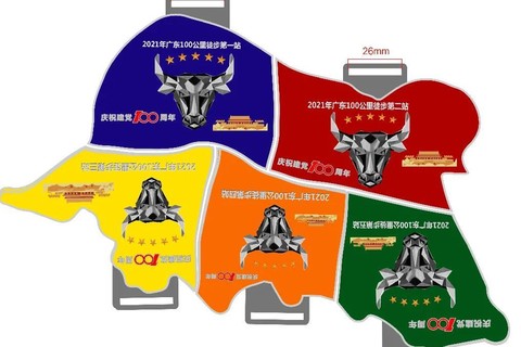 2021牛年广东100公里徒步活动奖牌设计思路:每参加一站活动可活动一块奖牌,参加完广东100公里五站活动可活动5块奖牌,5块奖牌可拼成一头牛,象征着牛运连年~