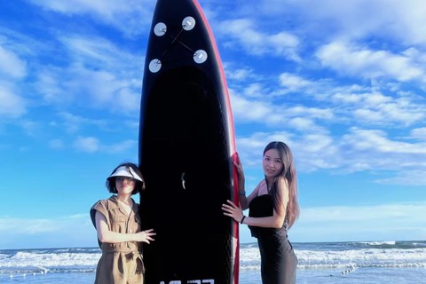 体验在海浪中玩桨板的刺激舒爽。坐在桨板上,随着海浪摇摆。