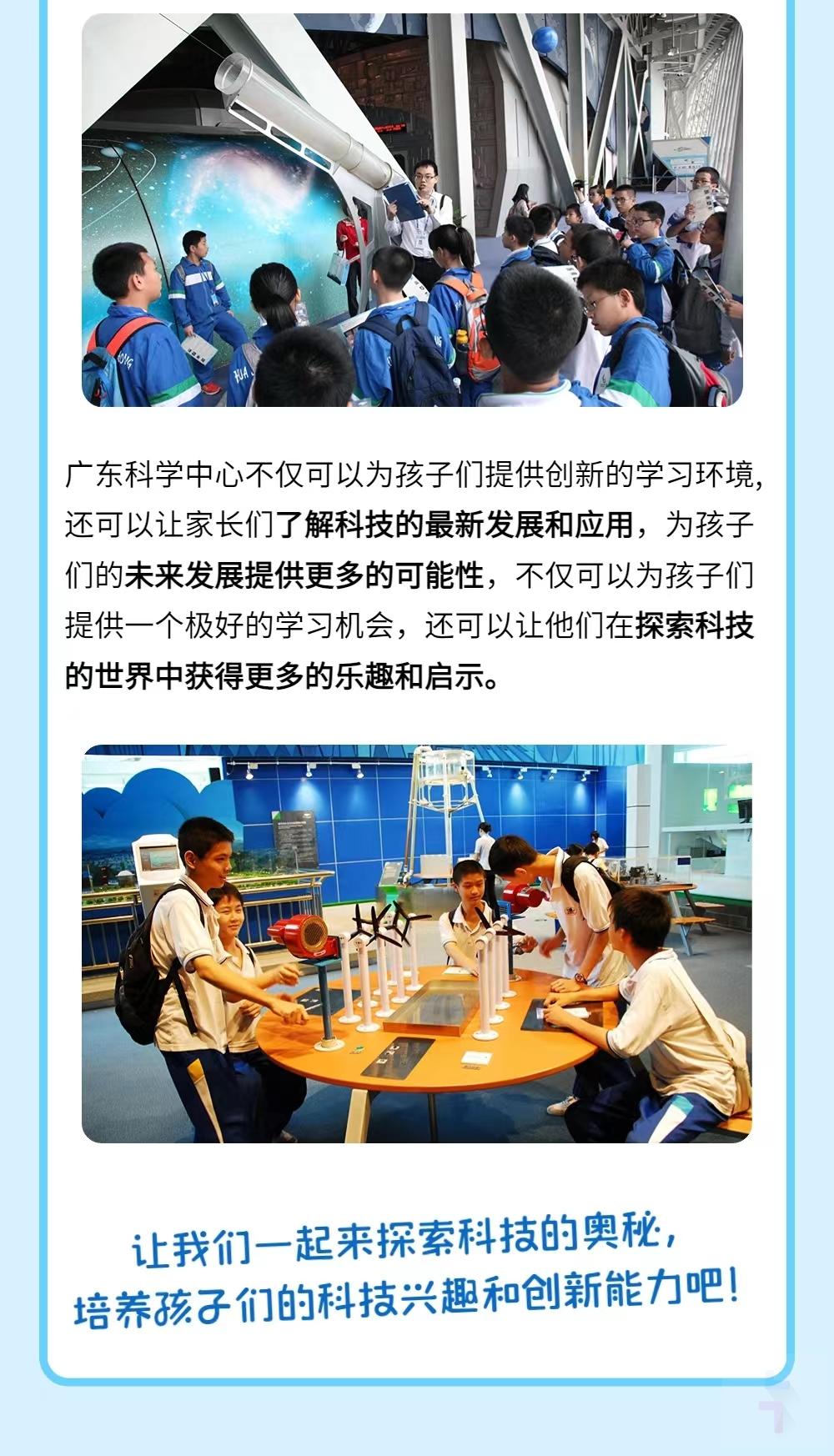 “亲近科技探究,童心逐梦”为主题的广东科学中心研学活动。因为同学们正处于好奇心和探究欲旺盛的年龄段,为了满足同学们的求知欲,拓宽同学们的知识面,我们特别设计了本次研学旅行,希望引导同学们通过直接感知、亲身体验和实际操作进行科学探究,从而了解科学的神奇,体验发现的乐趣,进一步培养同学们爱科学、学科学的兴趣。开启一场科学与发现的美妙体验之旅!