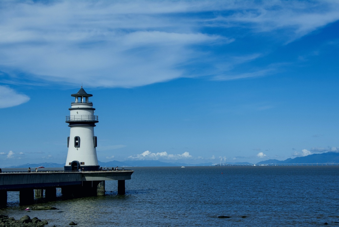 可鸟瞰月贝、珠港澳大桥、海滩、