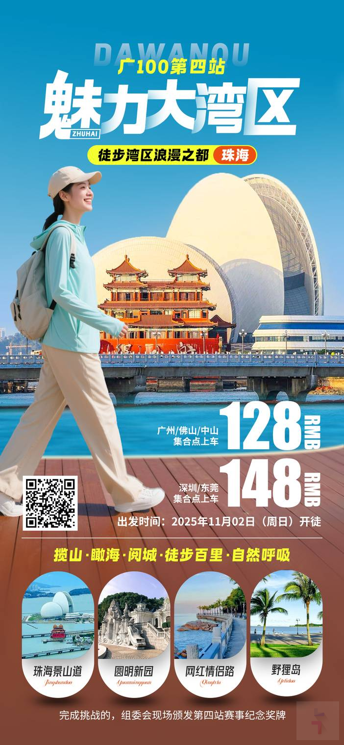 广100以“ 徒步百里,自然呼吸 ”为主题,将热爱自然、追求健康的徒步爱好者聚在一起,用脚步丈量世界,能感受岭南大地的魅力。活动地点将在广州周边举行,让大家捕捉徒步的沿途美景之余,还能拥有健康的体魄。